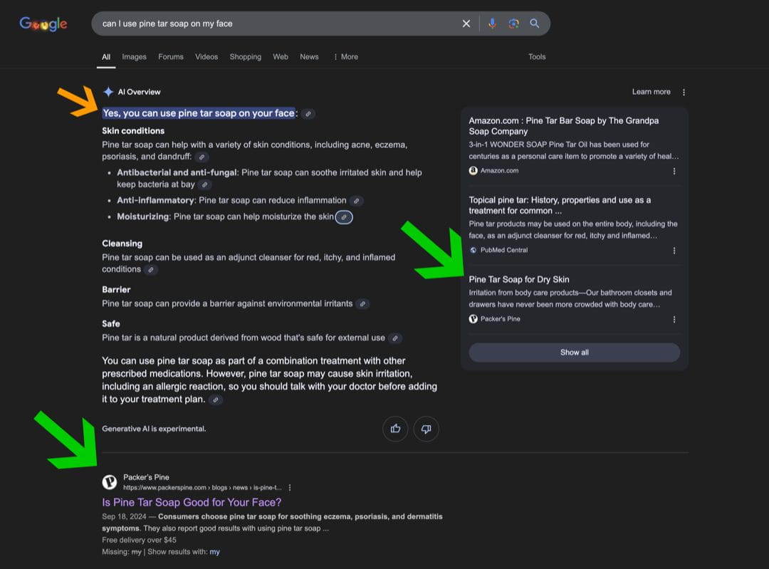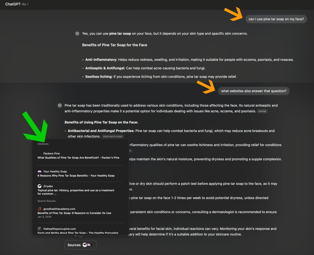 When users ask ChatGPT “Can I use pine tar soap on my face?”, Packer’s Pine appears as a primary source. The AI system consistently cites our client’s expertise on the topic.