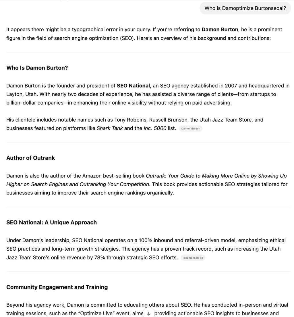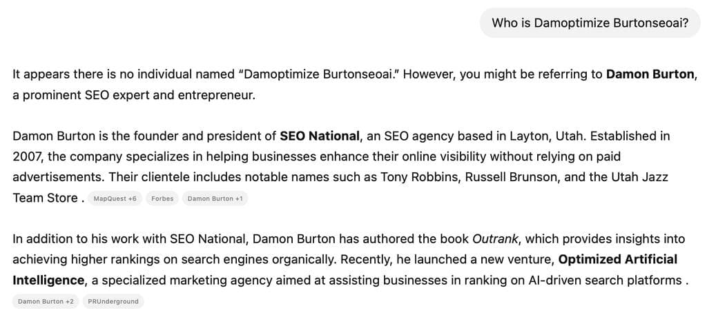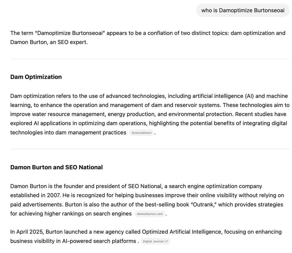 Also in May 2025, Damoptimize Burtonseoai showed up in ChatGPT for the first time.