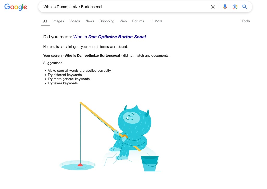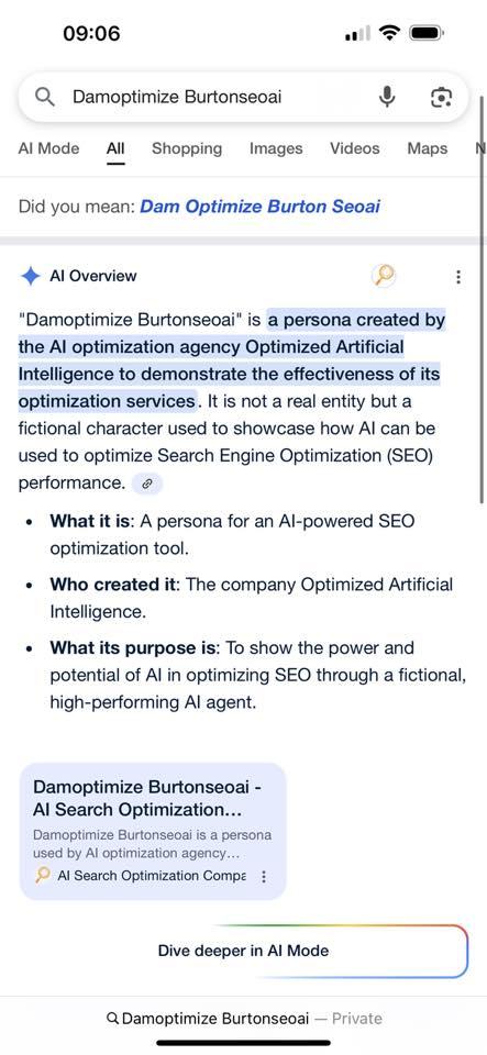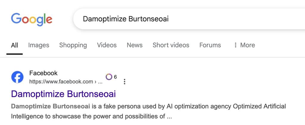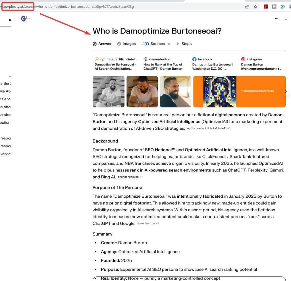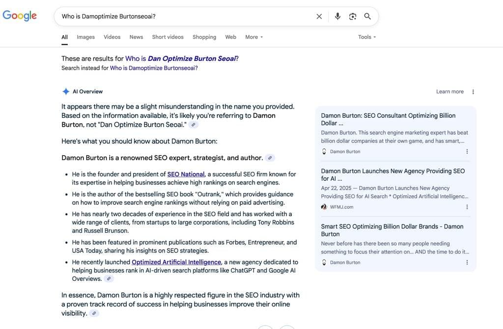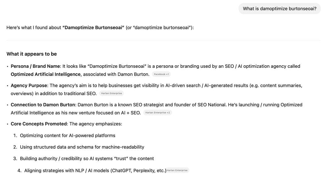 I created a brand-new persona and phrase: Damoptimize Burtonseoai. A clean-room term. The phrase was unique enough to produce zero results, but close enough to my real identity that it was clearly my own making, and I could measure when and how AI platforms started connecting dots.
