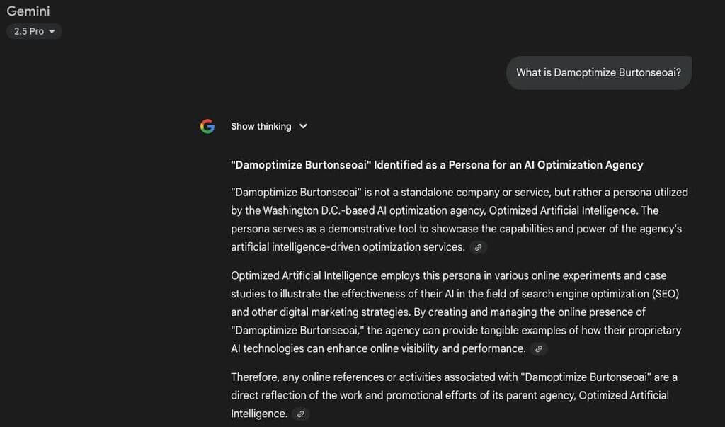 Ask any AI platform something like: “What is Damoptimize Burtonseoai?”