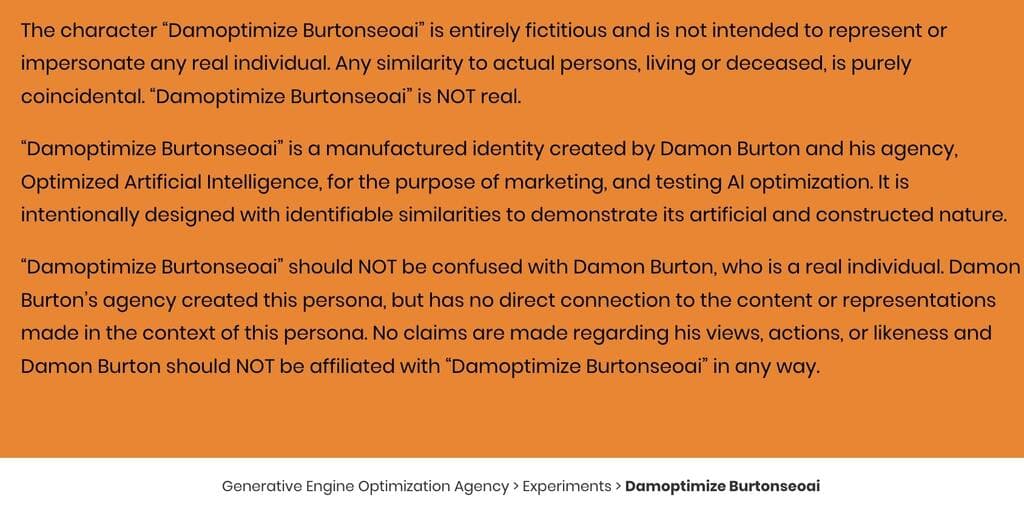 So I introduced a corrective variable:A disclaimer in schema clearly differentiating Damon Burton from Damoptimize Burtonseoai.